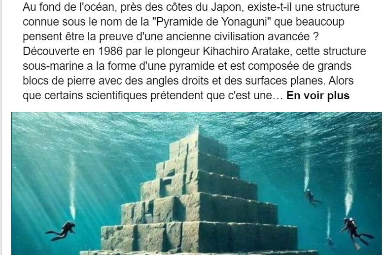 Le 1er juillet, la page Facebook « Mon Itinéraire » publie une photo montrant une pyramide sous l’eau. L’auteur de cette publication prétend que celle-ci est le Pyramide de Yonaguni au fond de l’océan, près des côtes du Japon découverte en 1986 par le plongeur KihachiroAratake. Méfiez-vous, après notre enquête, nous avons découvert que cette image est générée par l’intelligence artificielle.