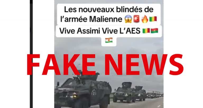 La vidéo de 52 secondes a été largement partagée dans les groupes WhatsApp et sur les réseaux sociaux. Nous n’avons pu trouver l’origine exacte de la vidéo, accompagnée de la légende « Les nouveaux blindés de l’armée Malienne Vive Assimi Vive L’AES ».