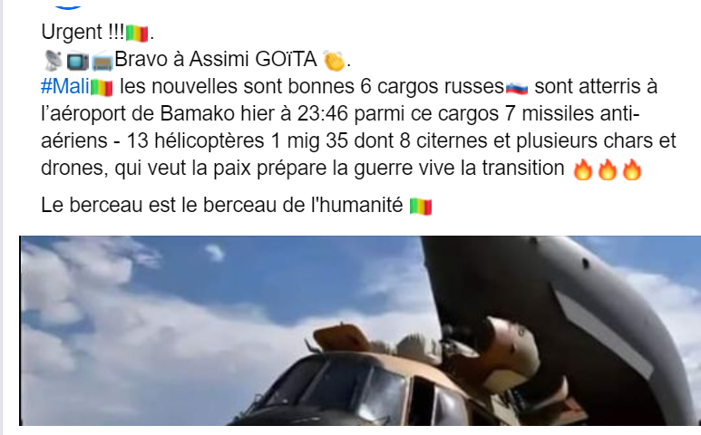 « Mali : Les nouvelles sont bonnes. 6 cargos russes ont atterri à l’aéroport de Bamako. Selon nos informations recueillies, ce vendredi aux environs de 23h46, l’armée malienne a reçu des nouveaux matériaux de guerre. Dans le chargement :7 missiles anti-aériens – 13 hélicoptères ,1 mig 35 ,8 citernes ,plusieurs chars et drones.Qui veut la paix prépare la guerre vive la transition », légende le publicateur du post qui a recueilli plus de 1480 likes, 219 partages et de commentaires.