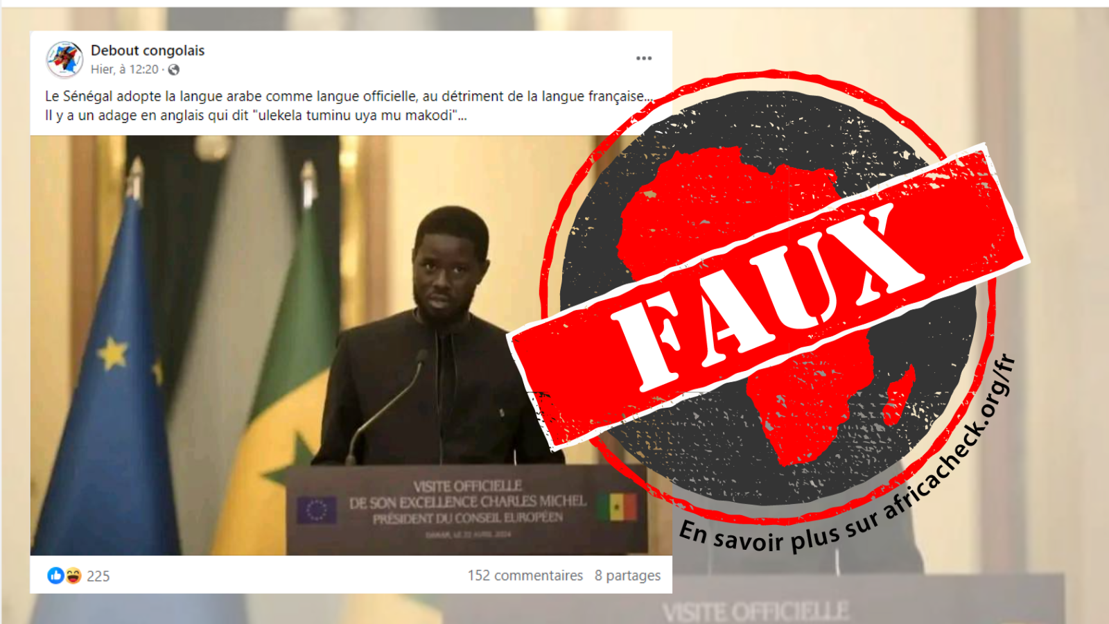 Dans ce contexte, une publication faite le 1ᵉʳ mai 2024 par la page Facebook Debout congolais indique : « Le Sénégal adopte officiellement l’arabe comme langue maternelle, au détriment de la langue française (…) ».